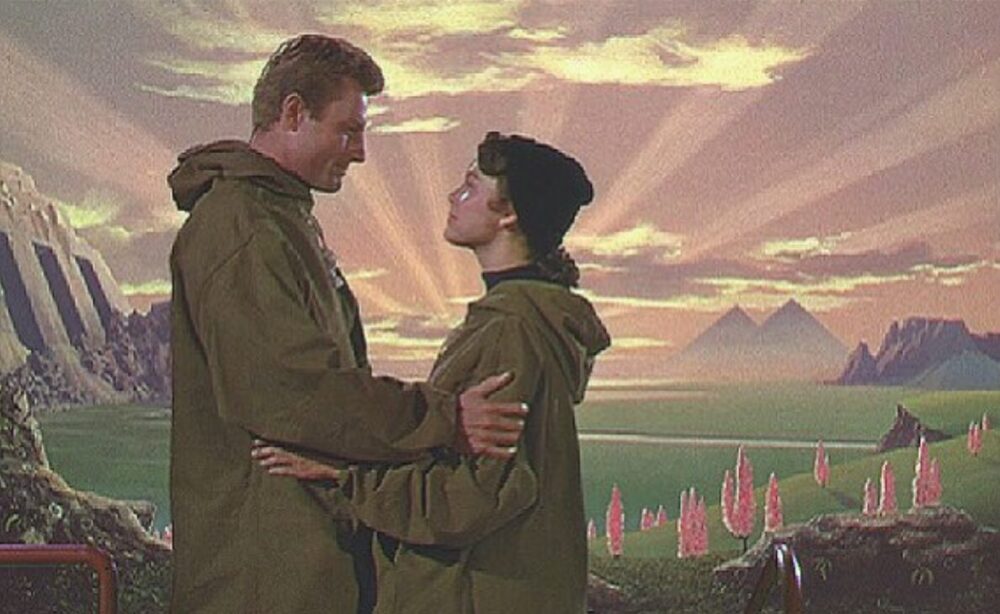 だが、映画はその問いに答えを与えない。宇宙船「アーク」が惑星ザイラに着陸し、ハッチが開く。デヴィッド・ランドールとジョイス・ヘンドロンが新天地に降り立つと、そこには緑の大地と青い空が広がっている。遠くには山々が連なり、地平線の左右には人工物らしき構造物がかすかに見える。天使の合唱のような音楽が高まり、カメラは二人の後ろ姿を捉えたまま、映画は終わる。
